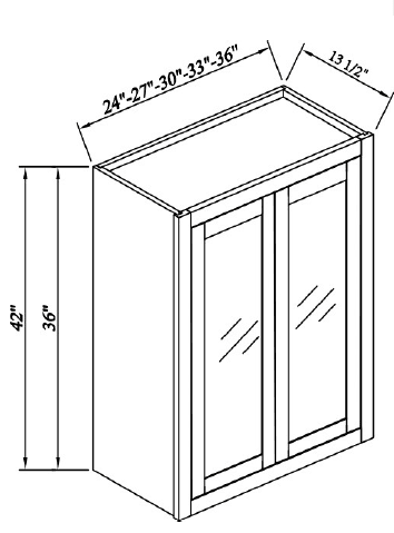 Inset Truffle Brown - Double Glass Doors Wall Cabinets 30'' H and 36” H Cabinets with 2 Adj. Shelves 2 Glass Inserts included Door width 13-3/8" Height 32-6/8" GLASS INSERT 5mm Width 9-3/8" Length 28-6/8"